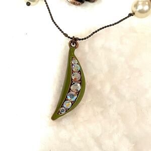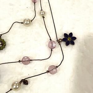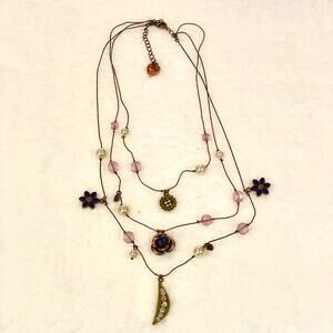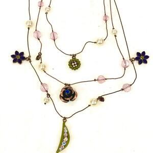 EUC is a multi layered necklace by Betsey Johnson. This is three strands in different lengths. Each stand has various charms, beads, faux pearls . Chain color is bronze. Some tarnishing on heart that is at the end of the necklace from being in my jewelry box for awhile.