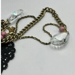Betsey Johnson Multistrand Webb Bows Pink Beads Crystals Black Heart Necklace. This is an elaborate, multi-layered statement necklace with a distinctly vintage or bohemian style.