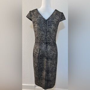 Texture knit foil print sheath dress. V neckline. Seam at waistline. Dress lined with tricot lining.