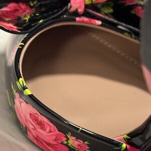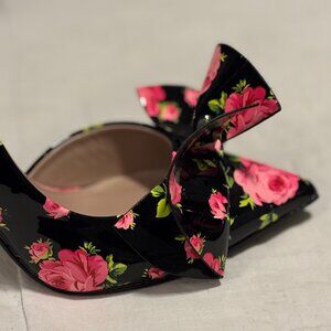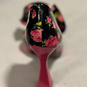 Black multi floral print, oversized bow toe, stiletto heel, slip-on d’Orsay style, signature Betsey Johnson pink sole, comes with original box