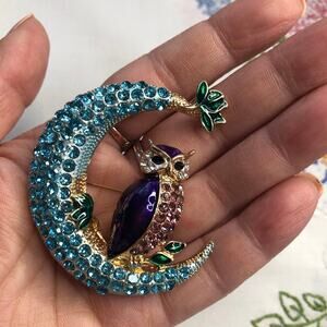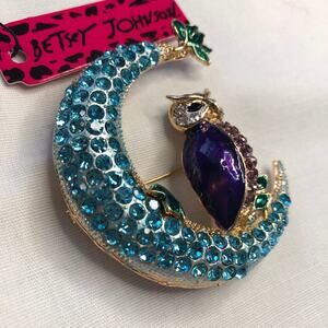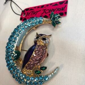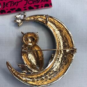 Betsey Johnson Owl in the Moon Brooch Pin Enamel & Rhinestone Embellished Cute