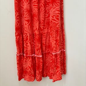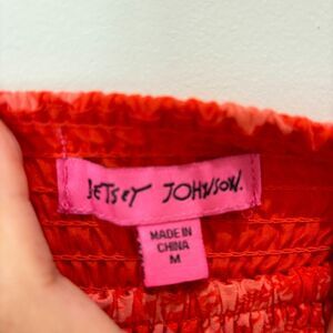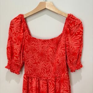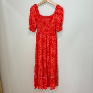 Features: Gorgeous dress by designer Betsey Johnson. Features square neckline, smocking at the bodice, puff sleeves, and tiered ruffled midi skirt. Soft, comfortable, and pretty enough to wear all day and night. All in fun bold coral orange floral colorway.