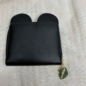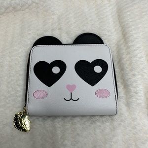 Adorable Luv Betsey by Betsey Johnson Panda folding wallet, zip around closure with gold hardware. Panda face with heart eyes and heart nose, topped with ears, stitched rosy cheeks