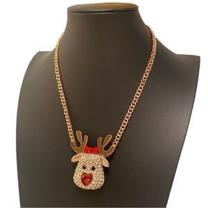 Betsey Johnson Pave Crystal Reindeer Pendant Necklace on Gold Toned Chain.