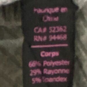 66% polyester, 29% rayon, 5% spandex. Machine washable.