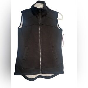 Chic black vest with a sleek design. Features a full zip front and high collar. Ideal for layering.