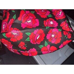 Betsey Johnson Pink And Red Colored Roses On Black Vinyl Cosmetic Bag W/Wristlet