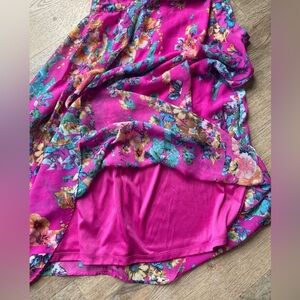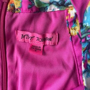 Brighten up your wardrobe with this vibrant Betsey Johnson floral swing dress in a bold fuchsia hue with multicolor floral print. Features a high neckline, sleeveless cut, and flowy A-line silhouette that flatters every body. Fully lined for comfort with a zip back closure.