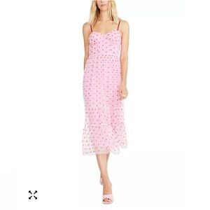 Fall in love with this stunning Betsey Johnson glitter heart tulle midi dress in a gorgeous pink mesh overlay with sparkly red glitter heart details. Features a sweetheart neckline, adjustable straps, fitted bodice with boning, back zip closure, and layered tulle skirt for the ultimate flirty and feminine silhouette. Perfect for Valentine’s Day, weddings, date night, prom, parties, or special occasions.