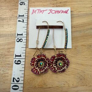 Betsey Johnson Pink & Gold Floral Drop Earrings Rhinestone, Garden Girl, Whimsy,