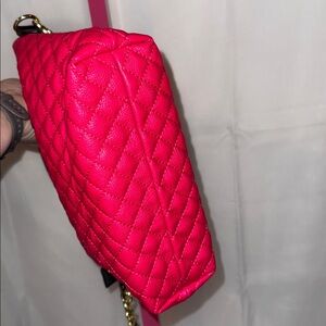 Chic pink quilted handbag. Features heart charm and black handles. Includes detachable strap.