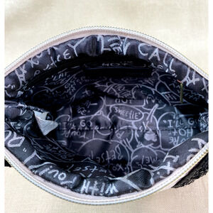 Betsey Johnson makeup bag with zipper closure and interior zip pocket. Pink quilted exterior with black sequin bunny ears and jeweled heart nose. Measures 9" x 6".