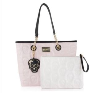 NWT Betsey Johnson 3 IN 1 Quilted Skulls Large Tote Handbag Blush Bone Purse w Pouch & Charm