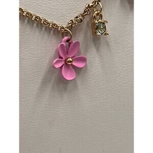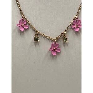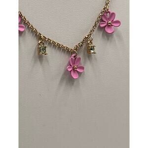 Betsey Johnson Pink Rubberized 3 Triple Flower Green Rhinestone Necklace