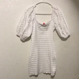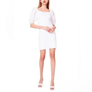 Betsy Johnson puff-sleeve bodycon mini dress in white. Worn only twice, like new condition. Super stretchy and comfy material. Cute embroidered lace trim on sleeves. Size small. Measurements in photos.