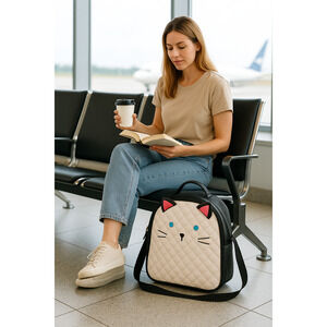 Travel just got a lot less boring. This Betsey Johnson cat carry-on is equal parts cheeky and chic — quilted faux leather with bright eyes, a detachable fishbone charm, and floral lining that makes packing fun. Gold-tone hardware, zip-around closure, and compartments to keep your life together (or at least looking like it).
