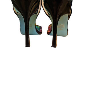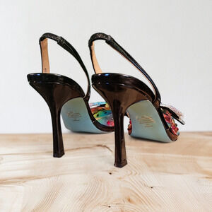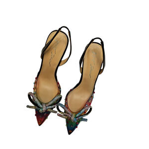 These vibrant Betsey Johnson slingback heels feature a stunning rainbow gradient design adorned with multicolored rhinestones and sparkling crystal bow accents. The pointed toe and sleek black straps add a touch of elegance, making them the perfect statement piece for any occasion.