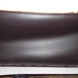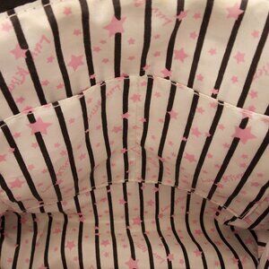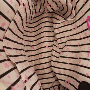 Approximately 12”l x 9”h x 4.5”w. Rainbow pattern on sides and black with heart patterns on front/back and one front zipper compartment. Has that cute crescent shape. Gold tone hardware with detachable crossbody strap. Interior is white and black stripes with pink stars, with one zip up compartment.