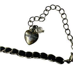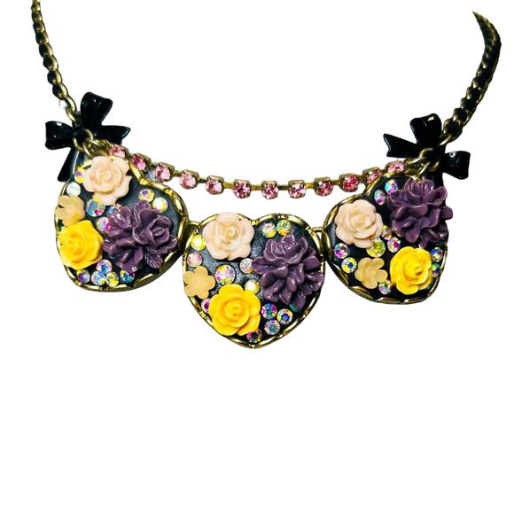 Triple heart with flower and rhinestones accents Betsey Johnson necklace. This necklace is a rare vintage statement piece. Gently used condition. No missing stones or parts. See pictures.