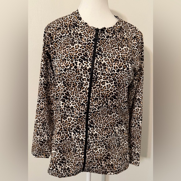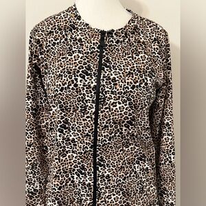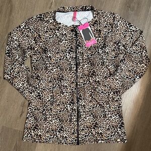 Chic rash guard long sleeve with full front zipper. Eye-catching leopard print design by Betsey Johnson.