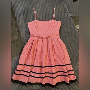 Adorable Betsy Johnson red and white gingham dress with black stripe accents. Features a charming design with thin straps. Size 2, side zip, built in slip and pockets on each side.