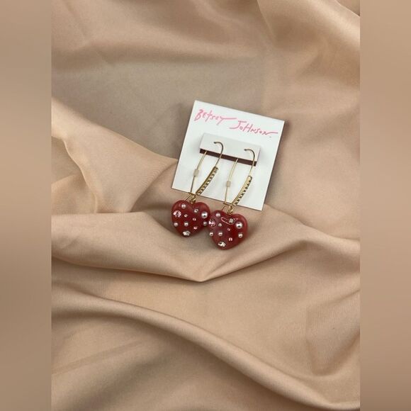 Adorable red heart-shaped earrings by Betsey Johnson, featuring pearl and rhinestone embellishments for a chic, playful look. Accented with gold-tone details and a touch of sparkle on the hooks. Perfect for adding a fun and unique statement to your outfit. Brand new with card.
