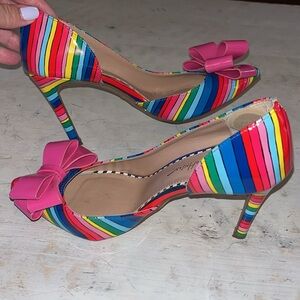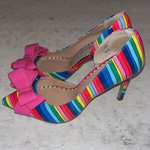 STUNNING pumps made by Betsey Johnson! It features a rainbow striped pattern and bright pink bow detail for a dramatic look. Super cute! Size 6. It is in VERY good pre-owned condition