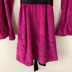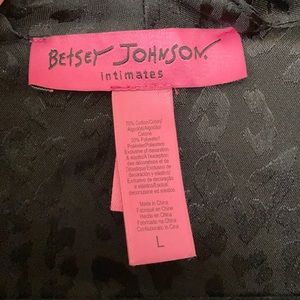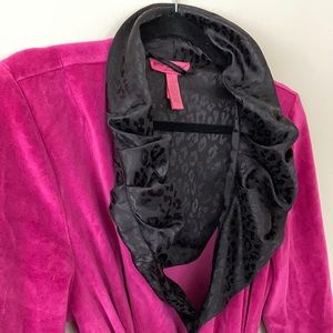Excellent used condition Betsey Johnson Robe. Ruffled neckline with leopard print black satiny fabric. Ruffles at sleeves. Has pockets and non removable tie at waist. Vibrant magenta in color.