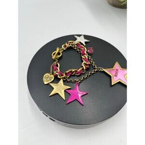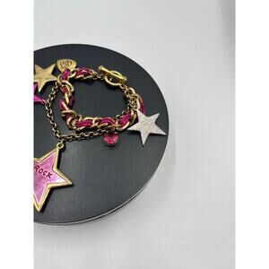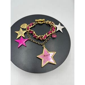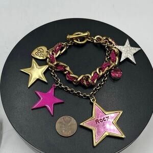 Betsey Johnson Rock Star Rhinestone Mirror Bracelet. This eye-catching piece features multiple star charms, some with rhinestones and a mirrored finish, attached to a chain-link bracelet with a toggle clasp. It's part of Betsey Johnson's "Rock Star" collection, known for its bold and whimsical designs.
