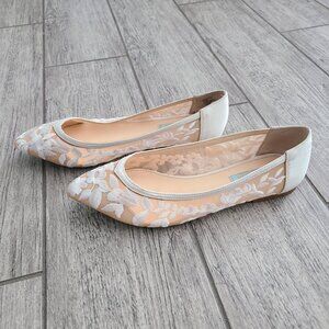 Elegant and romantic ivory lace flats by Betsey Johnson, perfect for weddings, special occasions, or adding a touch of femininity to any outfit. Features sheer floral mesh panels, satin trim, and the signature Betsey blue sole. These pointed toe flats combine comfort and style, ideal for brides or bridal parties.