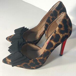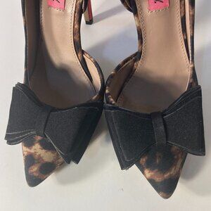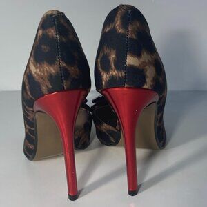 Betsey Johnson SZ 5 Prince P Leopard Print Red Stiletto Heel Black Bow Detail