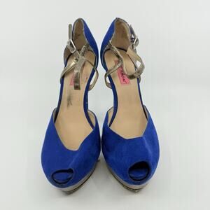 Make a bold statement with these eye-catching Betsey Johnson “Sabine” platform heels in a vibrant royal blue suede. Designed with a metallic silver platform, peep toe, and strappy ankle buckle, these shoes feature a signature Betsey twist—leopard print soles for unexpected flair.