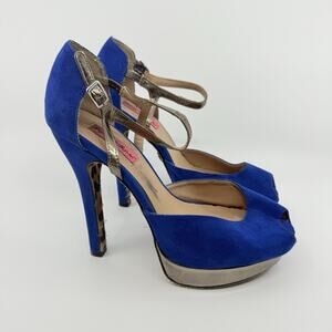 Betsey Johnson Sabine Blue Suede Heels Leopard Sole Size 7.5 Peep Toe Platform