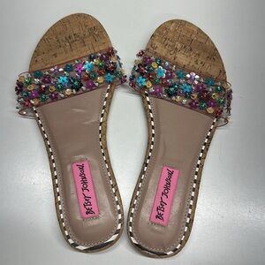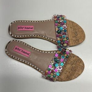Betsey Johnson Sandals Slides Flats Slip On Open Toe Shoes Floral Beaded New 6