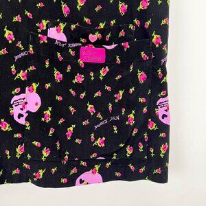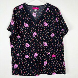Betsey Johnson Scrub Top Women's Size 2X Rosebud Skull Hearts Black Pink