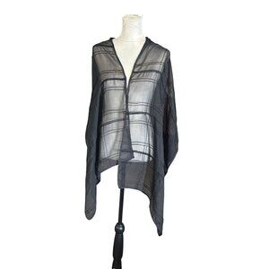 Elegant and versatile sheer wrap designed for sophisticated layering. Crafted with a translucent black fabric and intricate crochet edge detailing, this accessory adds refined texture and movement to professional and evening ensembles.
