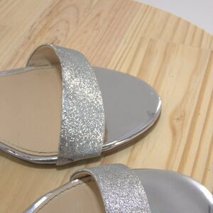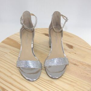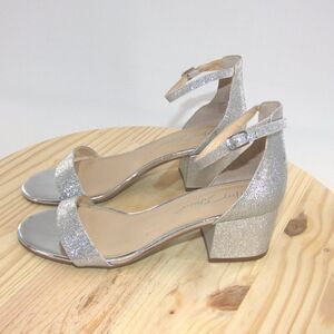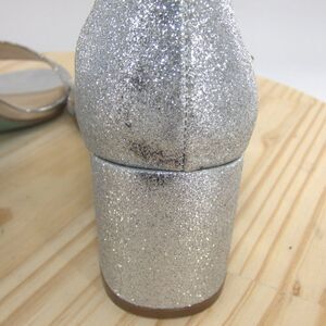 Sparkling silver heels with ankle strap. Chunky heel design. Perfect for special occasions.