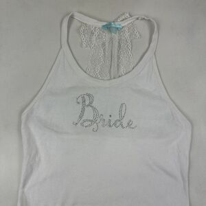 Betsey Johnson Size M White Ribbed Tank Top BRIDE Rinestones & Lace Racerback