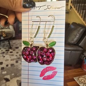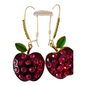 New with tags Betsey Johnson red and gold whimsical earrings. Features long ear wires accented with green crystals with dangling vibrant red apples adorned with coordinating stones.