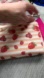 Charming wallet with strawberry print. Features a playful design with red strawberries on a striped background.