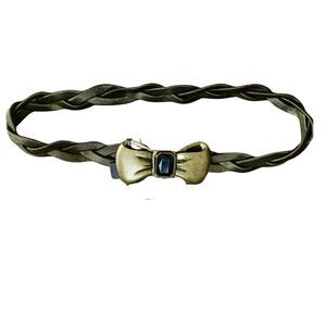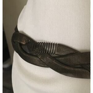 This fun belt is a distressed braided stretch metal, very solid and heavy. It clasps together in the middle of the bow with a dark garnet colored lucite finding.
