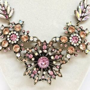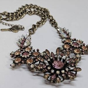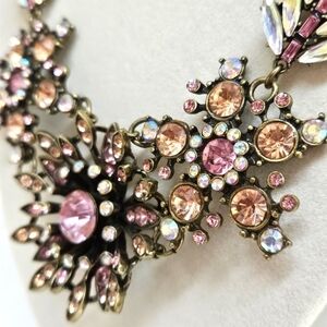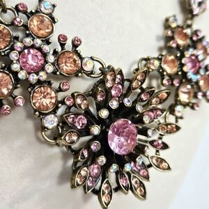 Stunning Betsey Johnson statement necklace. Bronze-tone hardware. Made of rhinestones in various shades of pink and aurora borealis. Chain link with adjustable back close. Chain measures about 16-19". Lobster clasp with logo key hang tag. Excellent condition and smoke-free home.