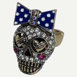 Betsey Johnson Sugar Skull Ring Sz 7 Crystal Stretch Ivy League Polka Dot
