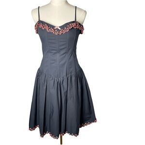This gorgeous vintage-inspired Betsey Johnson dress is a true statement piece! Featuring a structured corset-style bodice with boning for a flattering fit, it has a sweetheart neckline trimmed with playful coral eyelet embroidery and a tiny bow detail. The skirt flares beautifully with a fit & flare silhouette, finished with matching scalloped coral trim along the hem. Adjustable spaghetti straps and lace-up back detail add to the feminine charm.
