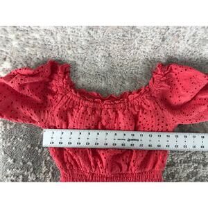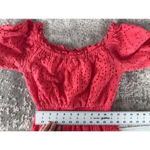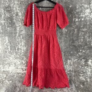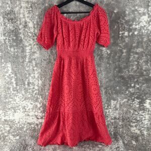 Betsey Johnson Sz M Eyelet Ruffle Party Elastic Waist Fit Flared Midi Dress Pink