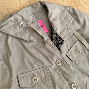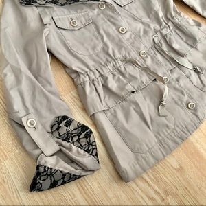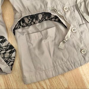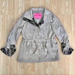 Super cute tan / khaki utility jacket by Betsey Johnson, size small. Black lace accents. Button down front, four front pockets, peplum style with drawstring waist band, drawstring in the collar, button roll tab sleeves, fully lined, cotton blend. Light weight. In excellent condition with only very light wear.