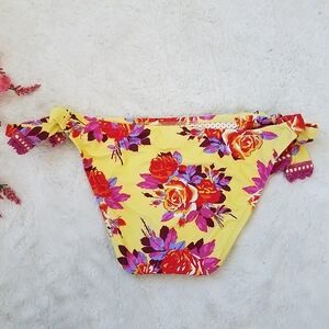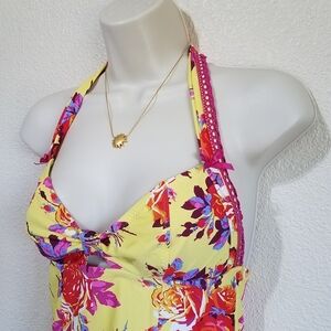 Both in excellent condition, floral rose print with embroidered/crochet trim, tankini halter neck with front cut out-not padded, bottom has bow ties on each side, both size small.