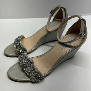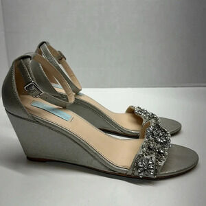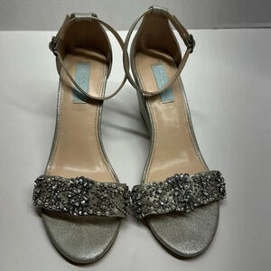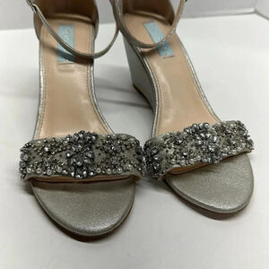 Betsey Johnson Taryn Wedges High Heel Shoes Jeweled Ankle Strap Silver Size 9