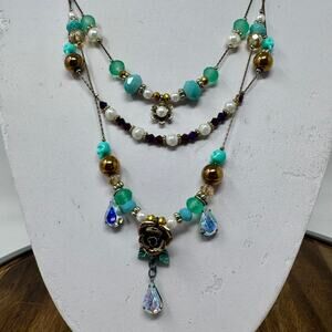 Betsey Johnson Teal Patina Pirate Skull Flowers 3 Tier Chain Necklace