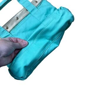 Women's small canvas tote by Betsey Johnson. This teal colored bag has a gold studded faux leather trim at the top, leopard print interior, and Betsey Johnson logo on the front on a faux leather patch.